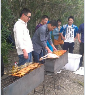 當日上海陽光普照,晴空萬里,氣溫23度左右剛好適合戶外郊游。上午九時許,所有員工在公司門口集合,整裝待發(fā),5輛汽車分別載著員工以及活動用品向目的地進發(fā)。一路上大家歡聲笑語,每個人都對這次野外活動充滿期待。路程并不算遠,半個小時我們就已經(jīng)到達了目的地,所有人緊張忙碌的布置現(xiàn)場,有的鋪地席,有的安裝燒烤爐,有的般吃的東西,大家忙得不亦樂乎,所有工作準備就緒之后,自助燒烤正式開始。大家都找自己想要吃的東西到烤箱自己去烤,雖然有的師父,但員工們還是愿意親自感受其中的快樂。
